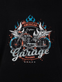 Hefty size t-shirt with "American GARAGE California" text with motorcycle print.