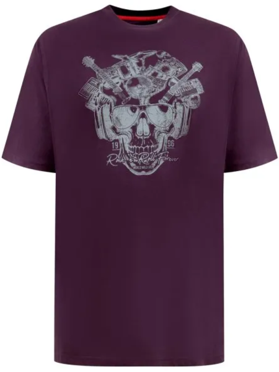 Unleash your inner rocker with the D555 GRIMSBY Rock 'n' Roll Skull Printed Crew Neck T-Shirt. Featuring a bold skull graphic with a rock 'n' roll twist, this burgundy t-shirt is perfect for music lovers, festival-goers, and those who love edgy streetwear. Made from 100% pure cotton, it ensures softness, breathability, and all-day comfort while making a bold statement.
